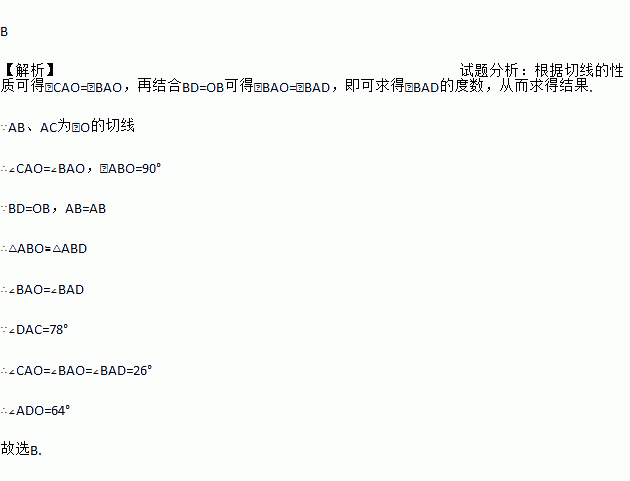 B 【解析】试题分析:根据切线的性质可得∠CAO=∠BAO,再结合BD=OB可得∠BAO=∠BAD,即可求得∠BAD的度数,从而求得结果. ∵AB、AC为⊙O的切线 ∴∠CAO=∠BAO,∠ABO=90° ∵BD=OB,AB=AB ∴△ABO≌△ABD ∴∠BAO=∠BAD ∵∠DAC=78° ∴∠CAO=∠BAO=∠BAD=26° ∴∠ADO...