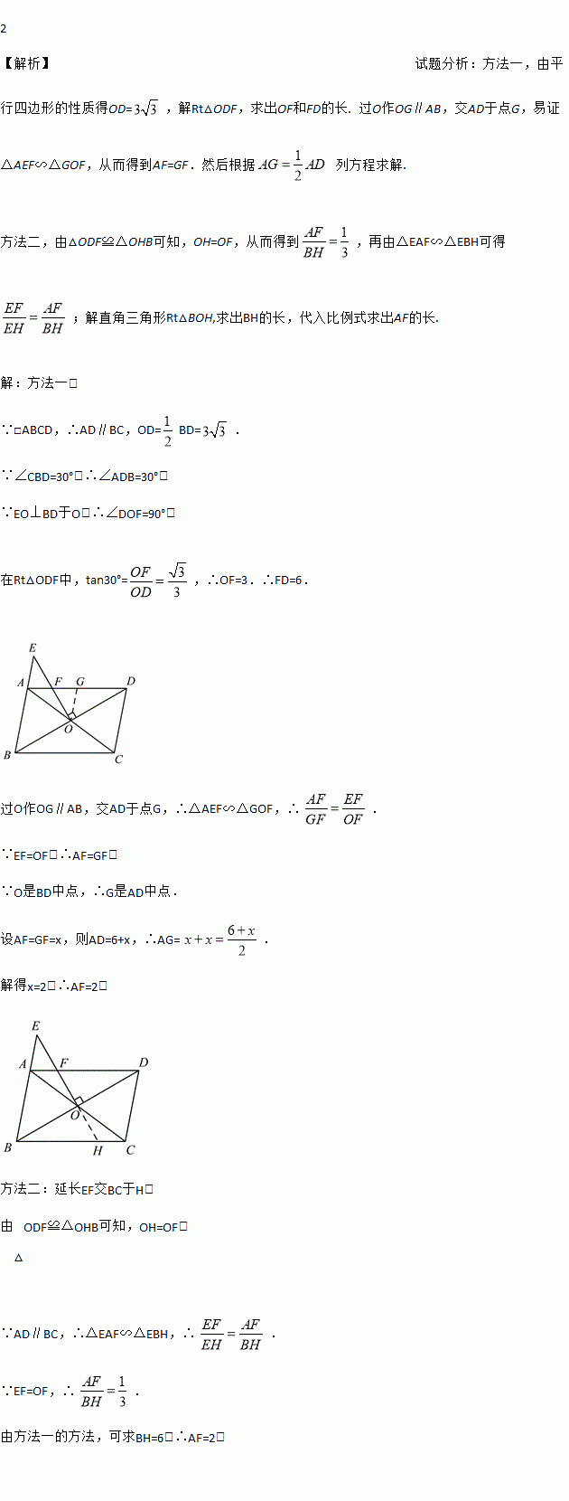 如图,在□ABCD中,对角线AC,BD交于点O,过点O作EO⊥BD,交BA延长线于点E,交AD于点F,若EF=OF,∠CBD=30°,BD=.求AF的长.
