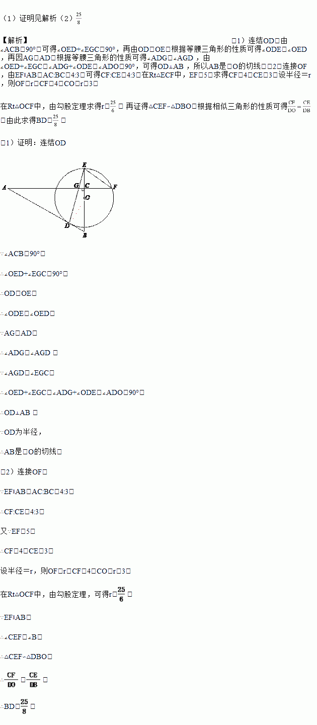 Rt△ABC中,∠ACB=90°,AC:BC=4:3,O是BC上一点,⊙O交AB于点D,交BC延长线于点E.连接ED,交AC于点G,且AG=AD.