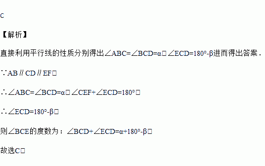 如图,已知AB∥CD∥EF,若∠ABC=α,∠CEF=β,则∠BCE的度数为( )