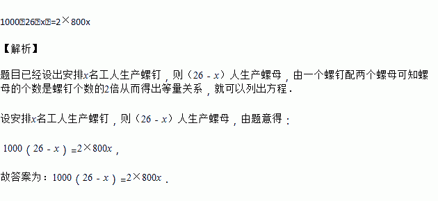 某车间有26名工人,每人每天可以生产800个螺钉或1000个螺母,一个螺钉需要配两个螺母,为使每天生产的螺钉和螺母刚好配套.设安排x名工人生产螺钉,根据题意可列方程得_____.