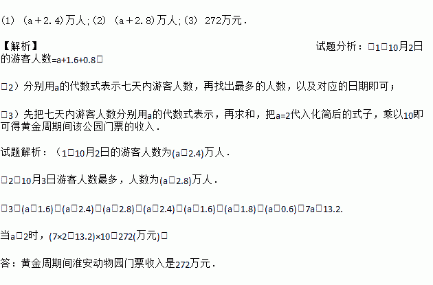 (1) (a+2.4)万人;(2) (a+2.8)万人;(3) 272万元. 【解析】试题分析:(1)10月2日的游客人数=a+1.6+0.8; (2)分别用a的代数式表示七天内游客人数,再找出最多的人数,以及对应的日期即可; (3)先把七天内游客人数分别用a的代数式表示,再求和,把a=2代入化简后的式子,乘以10即可得黄金周期间该公园门票的收入. 试题解析:(1)10月2...