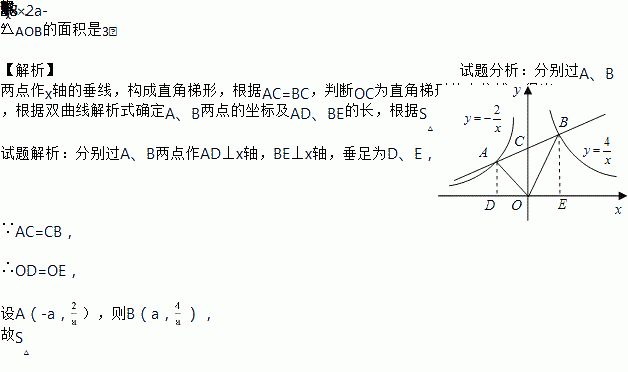 如图,点A是反比例函数在第二象限内图象上一点,点B是反比例函数在第一象限内图象上一点,直线AB与y轴交于点C,且AC=BC,连接OA、OB,求△AOB的面积.