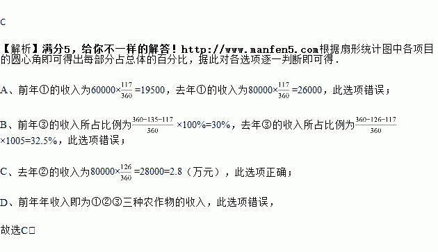 随着“三农”问题的解决,某农民近两年的年收入发生了明显变化,已知前年和去年的收入分别是60000元和80000元,下面是依据①②③三种农作物每种作物每年的收入占该年年收入的比例绘制的扇形统计图.依据统计图得出的以下四个结论正确的是( )
