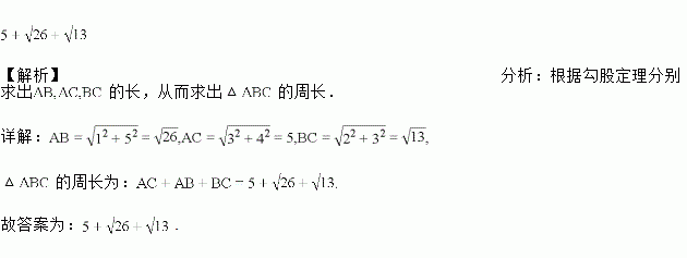 如图,正方形网格中,每个小正方形的边长为1,△ABC的顶点都在格点上,则△ABC周长是_________