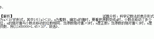 大美山水“硒都·恩施”是一张亮丽的名片,八方游客慕名而来,今年“五·一”期间,恩施州共接待游客1450000人,将1450000用科学记数法表示为( )