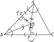 图中画出∠A,∠B的平分线交于点O.再画出点O到AB的垂线段OE,点O到BC的垂线段OF,(用圆规和三角尺作图,要求保留作图痕迹)