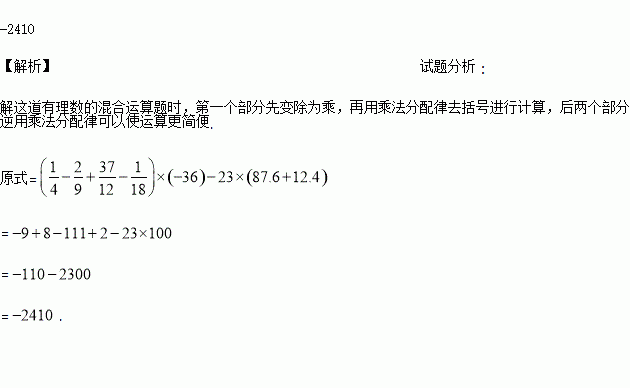计算:(-+3-)÷(-)-23×87.6-23×12.4.
