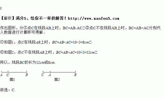 已知线段AB=10cm,点C在直线AB上, 且AC=2cm,则线段BC的长为( )