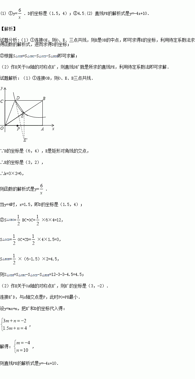 (2)若P是OA上的动点,求使得“PD+PE之和最小”时的直线PE的解析式.