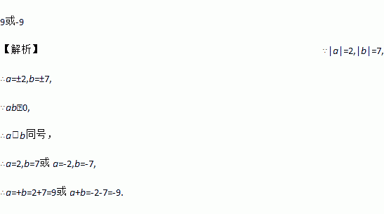 已知ab>0,|a|=2,|b|=7,则a+b=________.