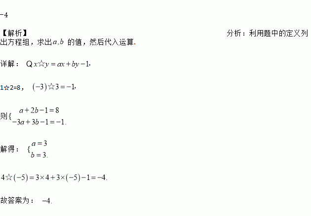 对于有理数x、y定义新运算x☆y=ax+by-1,其中a、b是常数,已知1☆2=8,(-3)☆3=-1,则4☆(-5)=___________。