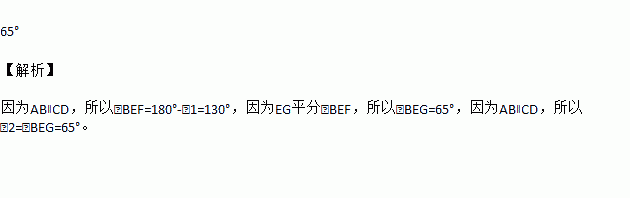 如图,已知AB∥CD,直线EF分别交AB、CD于点E、F,EG平分∠BEF,若∠1=50°,则∠2的度数为_______.