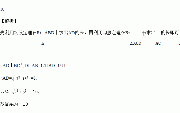 如图3,在△ABC中,AD⊥BC与D,AB=17,BD=15,DC=6,则AC的长为 __________.