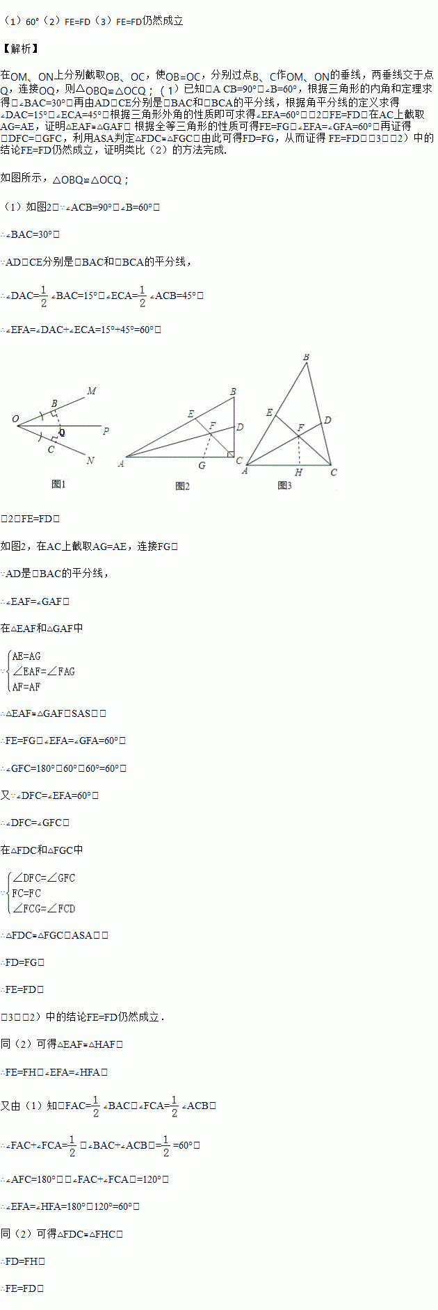 (1)如图2,在△ABC中,∠ACB是直角,∠B=60°,AD、CE分别是∠BAC和∠BCA的平分线,AD、CE相交于点F,求∠EFA的度数;