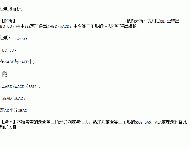 已知:如图,点D是△ABC内一点,AB=AC,∠1=∠2.求证:AD平分∠BAC.