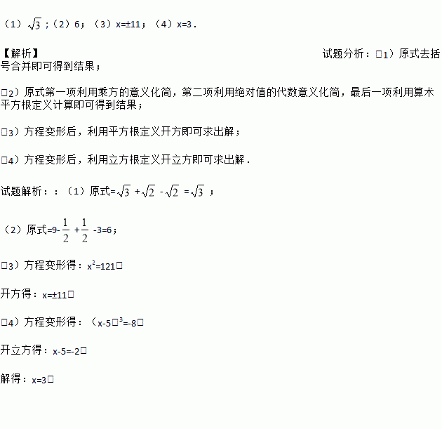 (1);(2)6;(3)x=±11;(4)x=3. 【解析】试题分析:(1)原式去括号合并即可得到结果; (2)原式第一项利用乘方的意义化简,第二项利用绝对值的代数意义化简,最后一项利用算术平方根定义计算即可得到结果; (3)方程变形后,利用平方根定义开方即可求出解; (4)方程变形后,利用立方根定义开立方即可求出解. 试题解析::(1)原式=+-=; (2)原...
