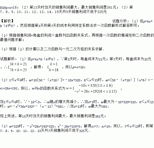 铁岭“荷花节”举办了为期15天的“荷花美食”厨艺秀.小张购进一批食材制作特色美食,每盒售价为50元,由于食材需要冷藏保存,导致成本逐日增加,第x天(1≤x≤15且x为整数)时每盒成本为p元,已知p与x之间满足一次函数关系;第3天时,每盒成本为21元;第7天时,每盒成本为25元,每天的销售量为y盒,y与x之间的关系如下表所示: