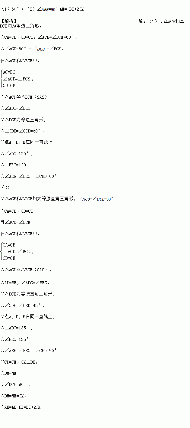 如图2,△ACB和△DCE均为等腰直角三角形,∠ACB=∠DCE=90°,点A、D、E在同一直线上,CM为△DCE中DE边上的高,连接BE.请求∠AEB的度数及线段CM,AE,BE之间的数量关系,并说明理由.