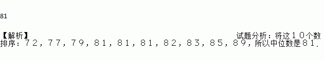 81 【解析】试题分析:将这10个数排序:72,77,79,81,81,81,82,83,85,89,所以中位数是81.