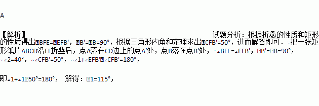 如图,把一张矩形纸片ABCD沿EF折叠后,点A落在CD边上的点A′处,点B落在点B′处,若∠2=40°,则图中∠1的度数为( )
