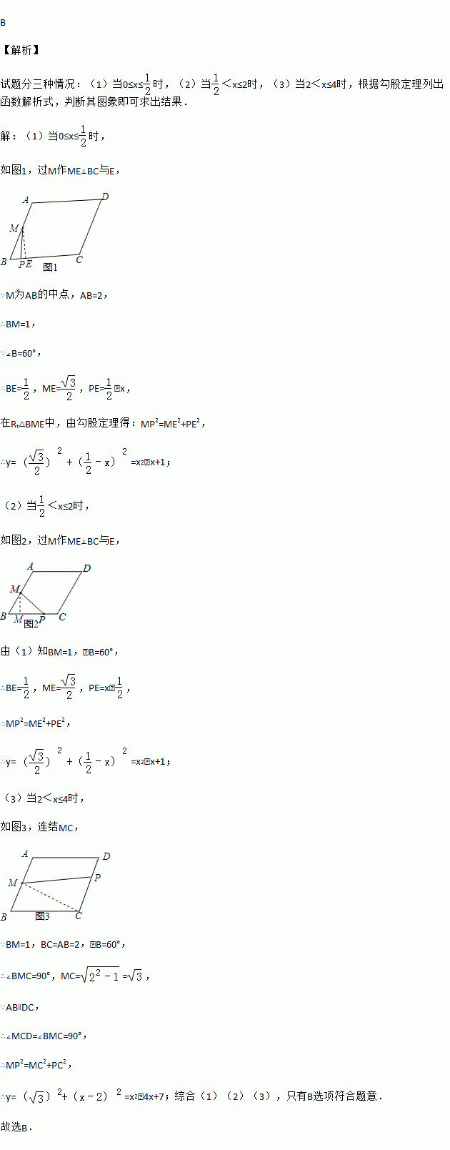 (题文)如图,菱形ABCD中,AB=2,∠B=60°,M为AB的中点.动点P在菱形的边上从点B出发,沿B→C→D的方向运动,到达点D时停止.连接MP,设点P运动的路程为x,MP 2=y,则表示y与x的函数关系的图象大致为( )