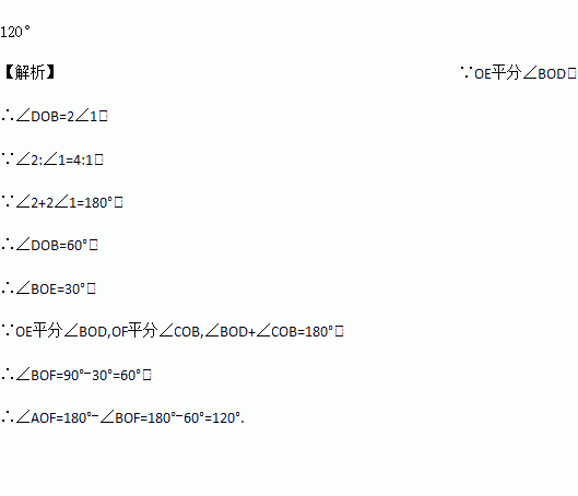 如图所示,直线AB交CD于点O,OE平分∠BOD,OF平分∠COB,∠AOD:∠EOD=4:1,则∠AOF=____________.