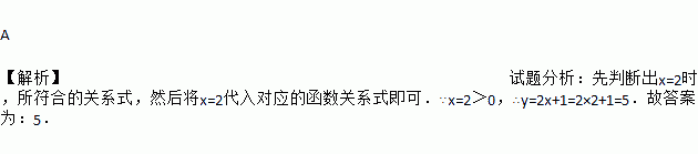 A 【解析】试题分析:先判断出x=2时,所符合的关系式,然后将x=2代入对应的函数关系式即可.∵x=2>0,∴y=2x+1=2×2+1=5.故答案为:5.