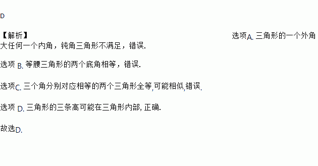 C. 三个角分别对应相等的两个三角形全等 D. 三角形的三条高可能在三角形内部