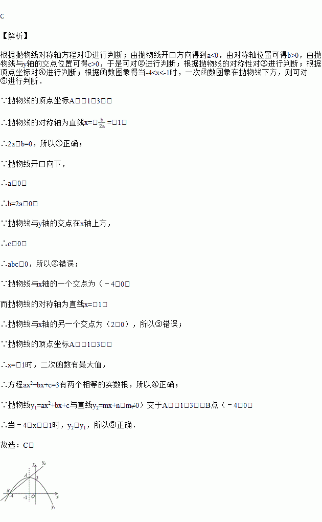 如图,抛物线y1=ax2+bx+c(a≠0)的顶点坐标A(﹣1,3),与x轴的一个交点B(﹣4,0),直线y2=mx+n(m≠0)与抛物线交于A,B两点,下列结论:①2a﹣b=0;②abc<0;③抛物线与x轴的另一个交点坐标是(3,0);④方程ax2+bx+c﹣3=0有两个相等的实数根;⑤当﹣4<x<﹣1时,则y2<y1 . 其中正确的是( )