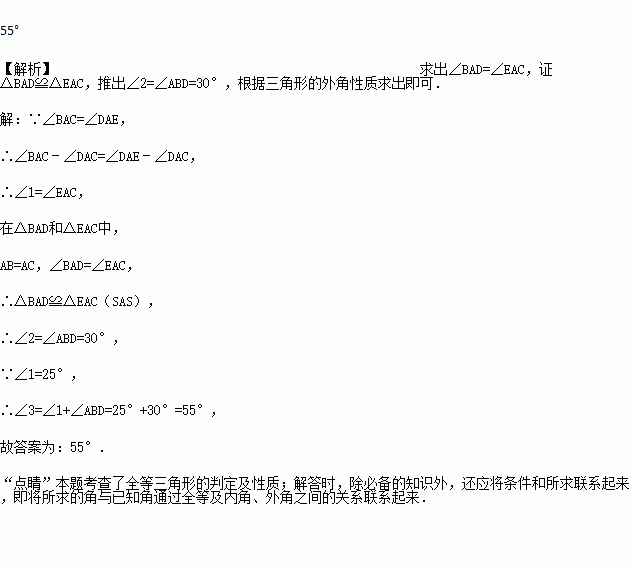 如图所示, AB=AC,AD=AE,∠BAC=∠DAE,∠1=25°,∠2=30°,则∠3=_____.