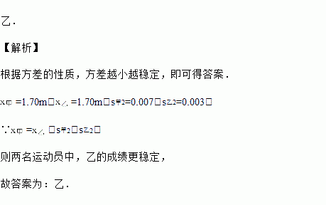 甲,乙两名跳高运动员近期20次的跳高成绩统计分析如下:x甲=1.70m,x乙=1.70m,s甲2=0.007,s乙2=0.003,则两名运动员中,_____的成绩更稳定.