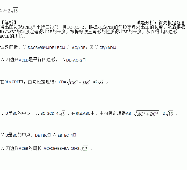 如图,在△ABC, 中,D是BC的中点,DE⊥BC,CE∥AD,若, ,求四边形ACEB的周长.