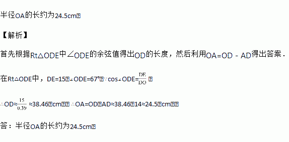 如图,点A、B为地球仪的南、北极点,直线AB与放置地球仪的平面交于点D,所成的角度约为67°,半径OC所在的直线与放置平面垂直,垂足为点E.DE=15cm,AD=14cm.求半径OA的长.(精确到0.1cm) (参考数据:sin67°≈0.92,cos67°≈0.39,tan67°≈2.36)