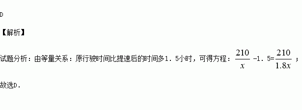 甲地到乙地的铁路长210千米,动车运行后的平均速度是原来火车的1.8倍,这样由 甲地到乙地的行驶时间缩短了1.5小时.设原来火车的平均速度为x千米/时,则下列方程正确的是 ( )