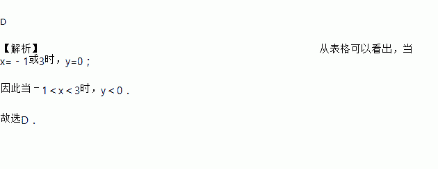 D 【解析】从表格可以看出,当x=﹣1或3时,y=0; 因此当﹣1<x<3时,y<0. 故选D.