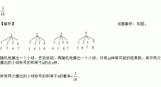 【解析】试题解析:如图, 随机地摸出一个小球,然后放回,再随机地摸出一个小球,共有16种等可能的结果数,其中两次摸出的小球标号的和等于4的占3种, 所有两次摸出的小球标号的和等于4的概率=.