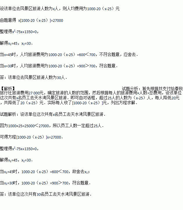 某单位组织员工去天水湾风景区旅游,共支付给春秋旅行社旅游费用27000元,请问该单位这次共有多少员工去天水湾风景区旅游?