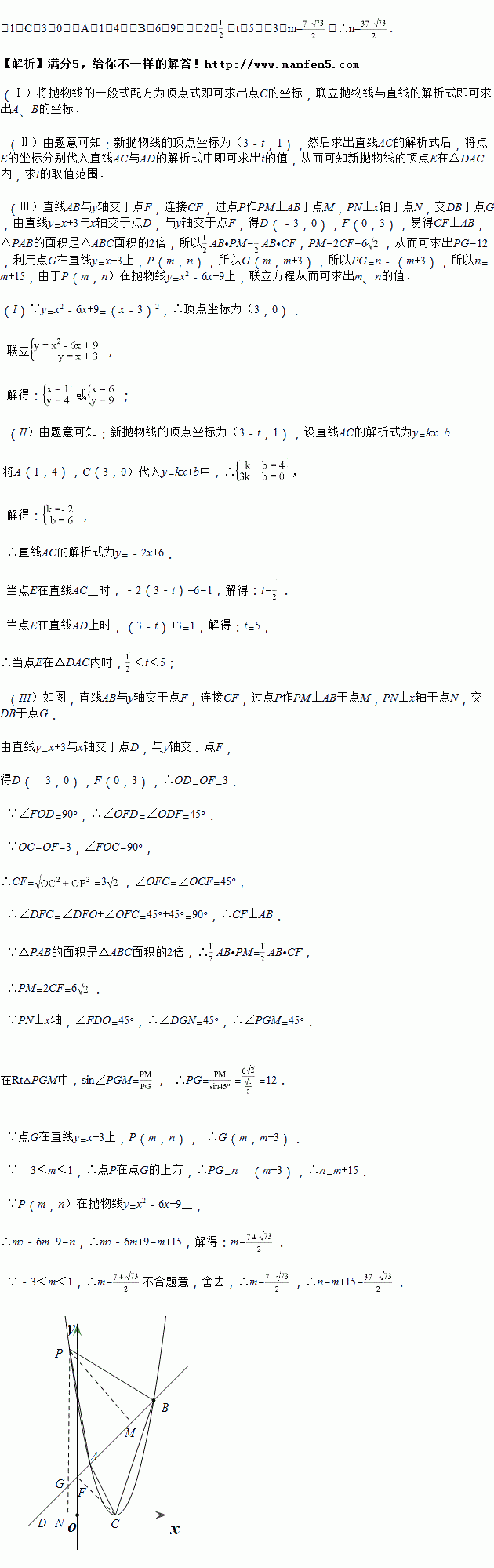 (2)将抛物线y=x2﹣6x+9向上平移1个单位长度,再向左平移t(t>0)个单位长度得到新抛物线,若新抛物线的顶点E在△DAC内,求t的取值范围;