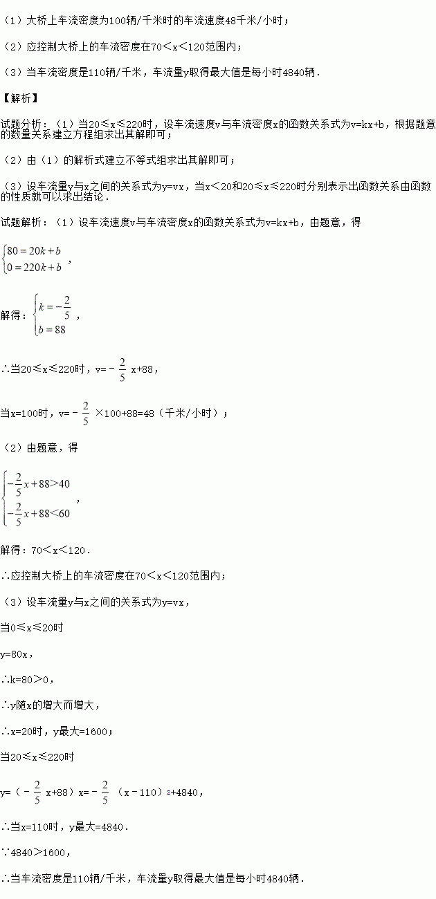 经统计分析,某市跨河大桥上的车流速度v(千米/小时)是车流密度x(辆/千米)的函数,当桥上的车流密度达到220辆/千米时,造成堵塞,此时车流速度为0千米/小时;当车流密度不超过20辆/千米时,车流速度为80千米/小时,研究表明:当20≤x≤220时,车流速度v是车流密度x的一次函数.
