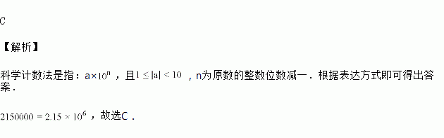 长春市农博产业园占地2150000平方米,数字2150000用科学记数法表示为( )A.21.5×105 B.2.15×105 C.2.15×106 D.0.215×107