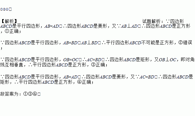 在平行四边形ABCD中,对角线AC与BD相交于点O,要使四边形ABCD是正方形,还需添加一组条件.下面给出了四组条件:①AB⊥AD,且AB=AD;②AB=BD,且AB⊥BD;③OB=OC,且OB⊥OC;④AB=AD,且AC=BD.其中正确的序号是_____.
