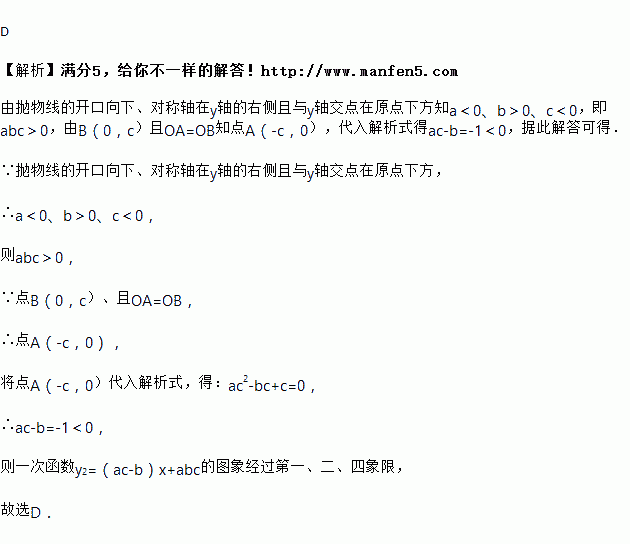 如图,已知二次函数y1=ax2+bx+c的图象分别与x轴的正半轴、y轴的负半轴于A、B两点,且OA=OB,则一次函数y2=(ac﹣b)x+abc的图象可能是( )