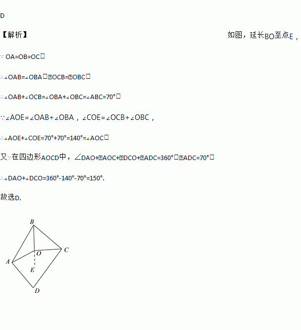 如图,已知O是四边形ABCD内一点,OA=OB=OC,∠ABC= ∠ADC=70,则∠DAO+∠DCO的大小是( )