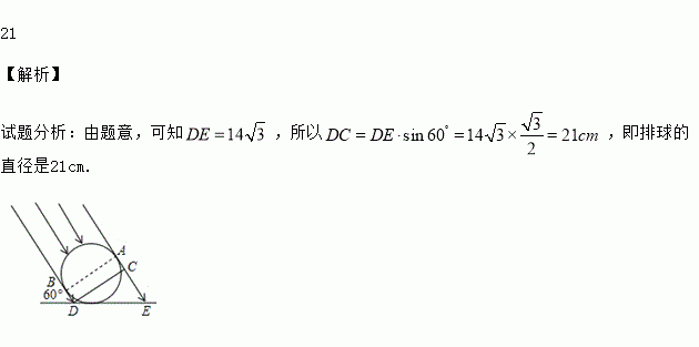 如图,太阳光线与地面成的角,照在地面的一只排球上,排球在地面的投影长是,则排球的直径是 ;