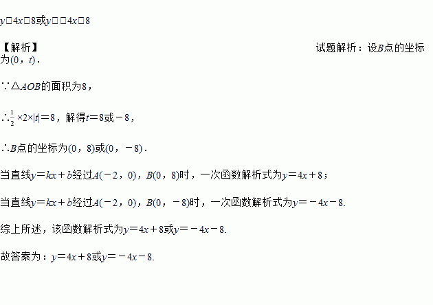 在平面直角坐标系中,O为原点,若一次函数y=kx+b的图象交x轴于点A(-2,0),交y轴于点B,△AOB的面积为8,则该函数解析式为______________.