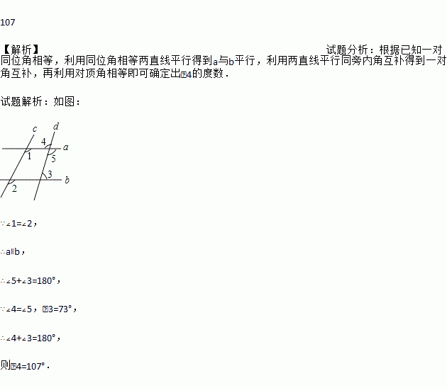 如图,已知∠1=∠2,∠3=73°,则∠4的度数为 度.