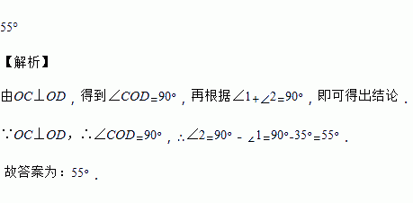 如图,点O为直线AB上一点,OC⊥OD,如果∠1=35°,那么∠2的度数是______________;