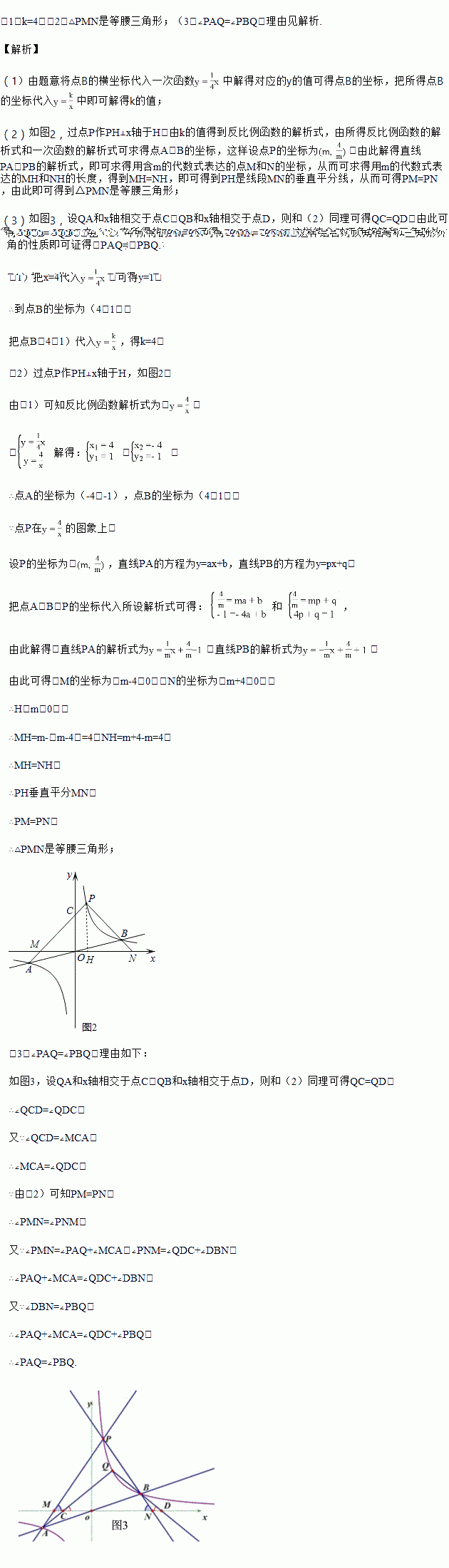 (3)设点Q是反比例函数图象上位于P,B之间的动点(与点P,B不重合),连接AQ,BQ,比较∠PAQ与∠PBQ的大小,并说明理由.