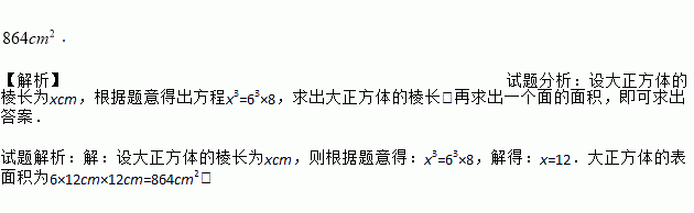 . 【解析】试题分析:设大正方体的棱长为xcm,根据题意得出方程x3=63×8,求出大正方体的棱长;再求出一个面的面积,即可求出答案. 试题解析:【解析】 设大正方体的棱长为xcm,则根据题意得:x3=63×8,解得:x=12.大正方体的表面积为6×12cm×12cm=864cm2.